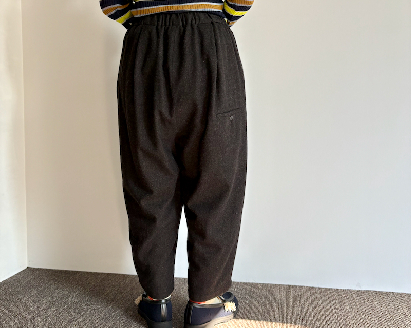 タックを腰回りに入れ、ボリュームをもたせ、裾にかけて