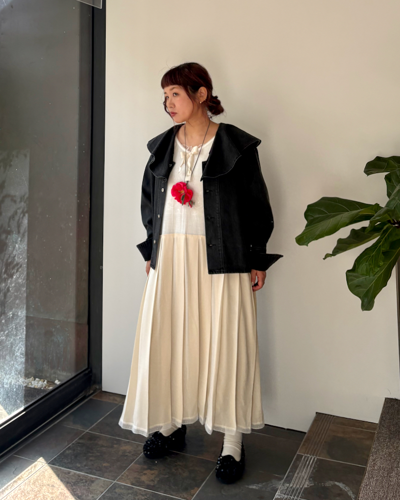 シンプルなワンピースに大きな付け襟を付けたスタイルは今回のお気に入り。